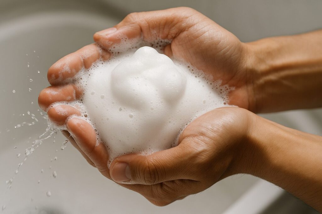 まずは基本の洗顔から。適量を手に取り、しっかりと泡立ててから、泡を転がすように優しく顔全体を洗います。すすぎ残しがないよう、特に髪の生え際やフェイスラインは念入りに洗い流しましょう。
